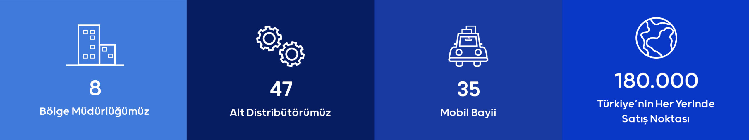 1 ana depo, 7 bölge deposu, 1 hibrit distribütör depo, 47 distribütörümüz ve 35 mobil bayimiz ile Türkiye’nin her yerinde 180.000’e yakın noktaya ulaşıyoruz.